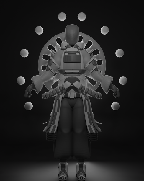This project showcases futuristic character designs, including a futuristic armored character with circular backdrop and spheres, and a futuristic armored figure with circular back design. These designs embody a sense of advanced technology and otherworldly aesthetics.
